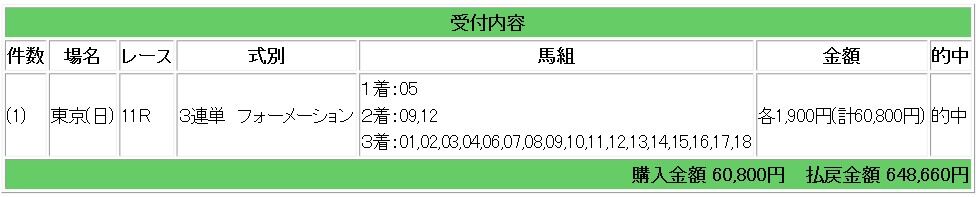 会員様には上記情報馬頭の馬連1点指示で4.9倍的中となり、29万4000円の払い戻しとなりました。