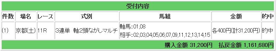 上記情報馬からの3連単指示で2904.2倍的中となり、116万1680円の払い戻しとなりました。