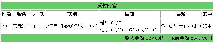上記2頭が1,3着となり、3連単940.3倍的中で56万4180円の払い戻しとなりました。