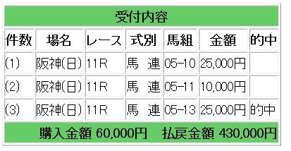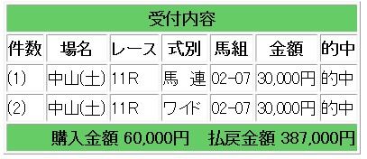 上記情報馬のワンツー決着となり、馬連9.1倍的中、ワイド3.8倍的中で19万3500円の払い戻しとなりました。